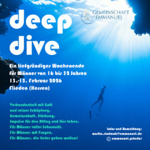 Ein tiefgründiges Wochenende für Männer zwischen 16 und 32 Jahren Verbundenheit mit Gott und seiner Schöpfung. Gemeinschaft. Stärkung. Impulse für den Alltag und fürs Leben. – Für Männer voller Sehnsucht. – Für Männer mit Fragen. – Für Männer, die tiefer gehen wollen. Motto: Deep Dive Flyer zum Download Termin: 31.–15. Februar 2026 Ort: Flieden (Hessen) […]