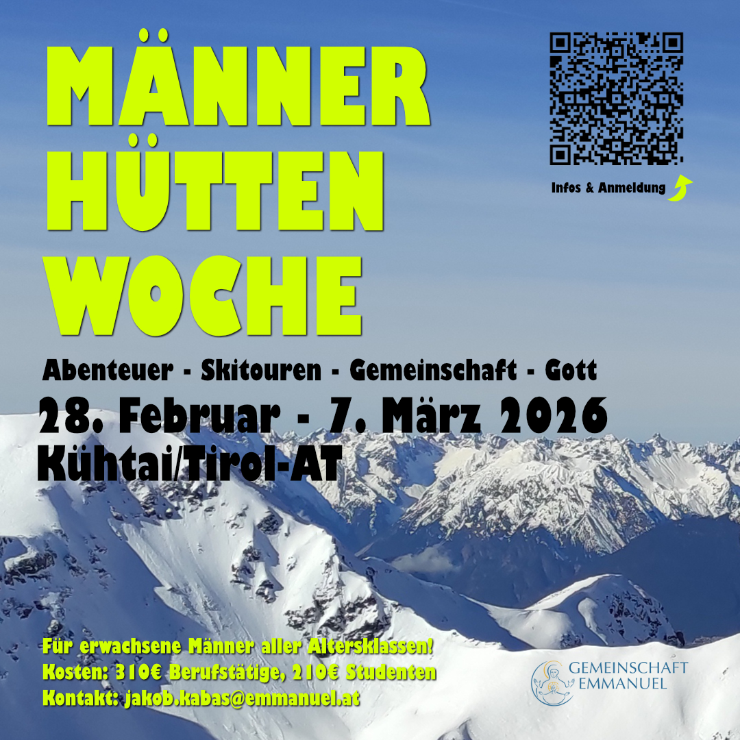 Die Männerhüttenwoche ist ein Angebot der Gemeinschaft Emmanuel für erwachsene Männer aller Altersklassen. Eine Woche in den Stubaier Alpen mit Skitouren, Schneeschuhwanderungen, geistlichem Programm, Kameradschaft und Gemeinschaft.