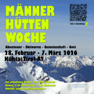 Ein tiefgründiges Wochenende für Männer zwischen 16 und 32 Jahren Verbundenheit mit Gott und seiner Schöpfung. Gemeinschaft. Stärkung. Impulse für den Alltag und fürs Leben. – Für Männer voller Sehnsucht. – Für Männer mit Fragen. – Für Männer, die tiefer gehen wollen. Motto: Deep Dive Flyer zum Download Termin: 31.–15. Februar 2026 Ort: Flieden (Hessen) […]