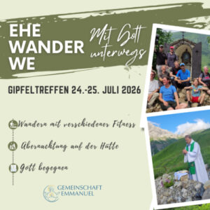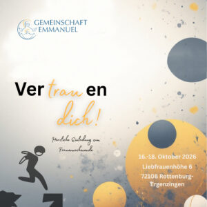 Wir sind berufen zu lieben – aber wie? An dem Wochenende wollen wir uns auf die Suche machen, begleitet von einem Ehepaar, einem Priester und Schwestern der Gemeinschaft Emmanuel um die Dimensionen des Frauseins in den Blick zu nehmen. Impulse, Gespräch, Zeiten der Stille, Gebet, Messe, Austausch, Gemeinschaft. BERUFEN ZUR LIEBE Wochenende für Frauen (18-35) Wo: […]