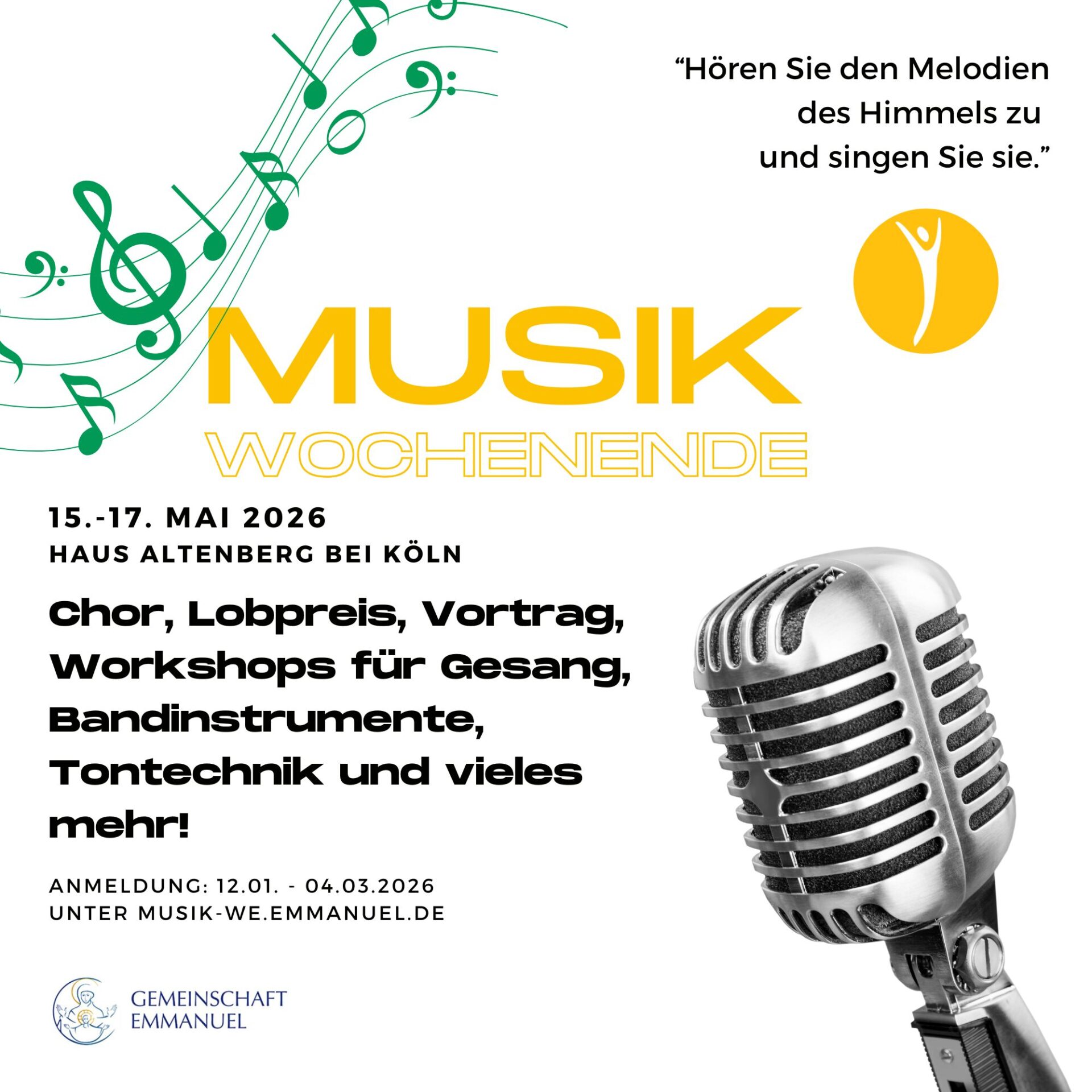 Die Lieder der Gemeinschaft Emmanuel sind für viele Menschen eine Bereicherung und Inspiration für das geistliche Leben und die Evangelisation. Wir laden an diesem Wochenende ein zum gemeinsamen Singen, Beten und Lernen. Workshops bieten die Möglichkeit, Neues auszuprobieren oder Talente zu vertiefen.
