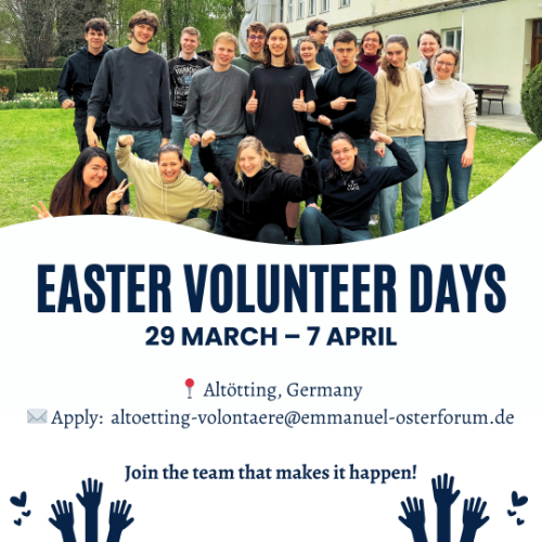 Helfer und Volontäre können sich gerne per E-Mail melden: altoetting-volontaere@emmanuel-osterforum.de